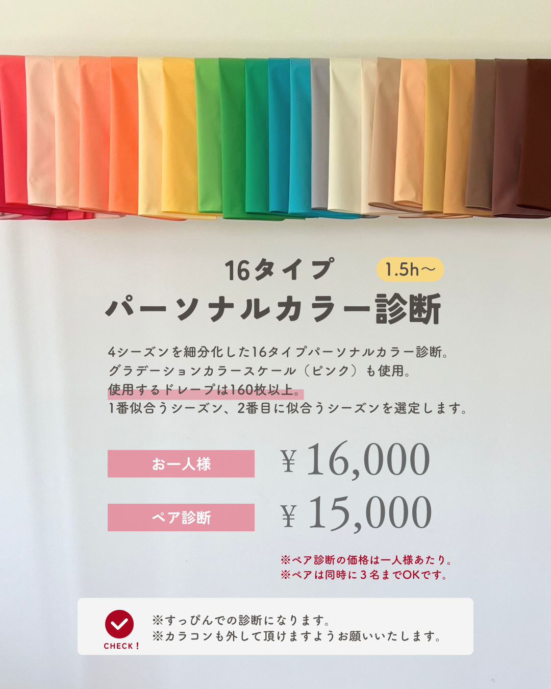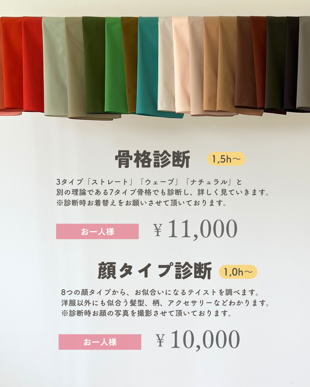 | パーソナルカラー診断(ペア)3名様まで可能 | 15,000円(お一人様あたり) |