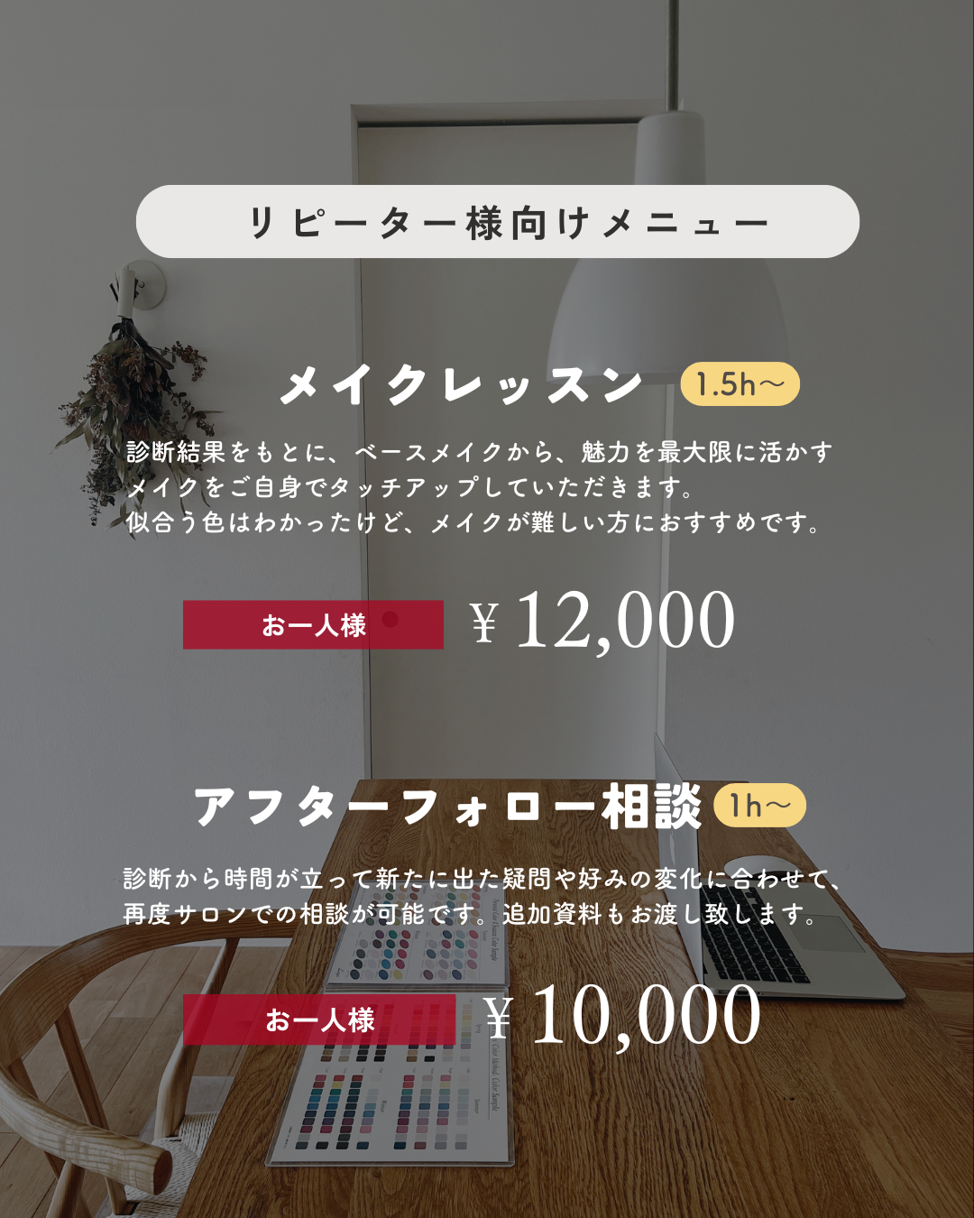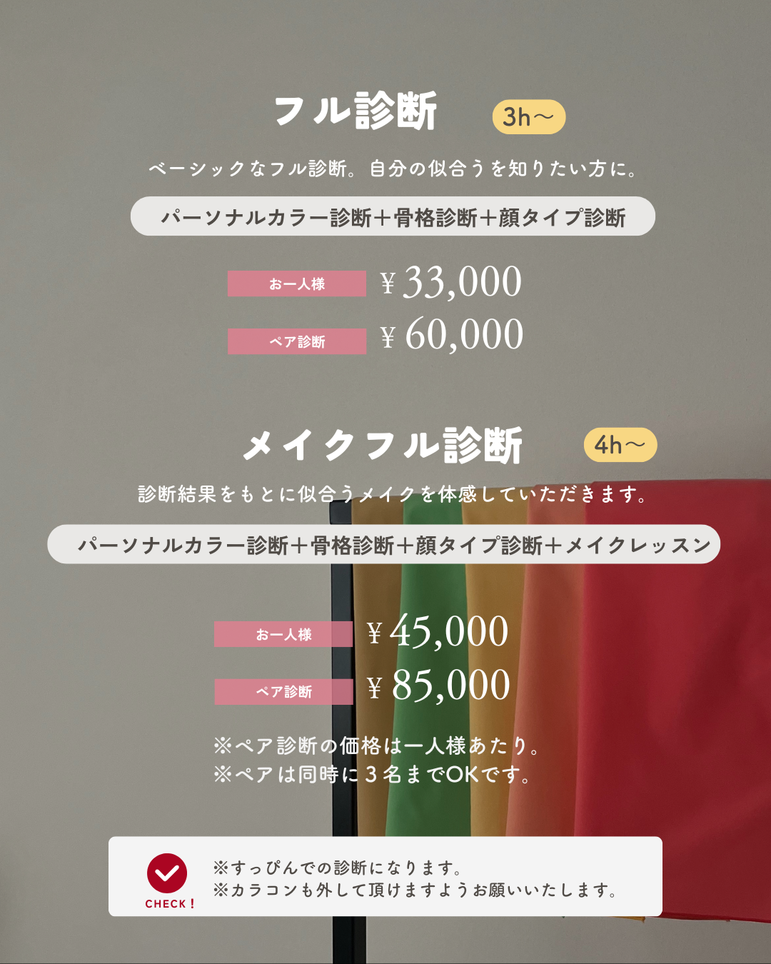 | フル診断&メイクレッスン(ペア)3名様まで可能 | 42,500円(お一人様あたり) |